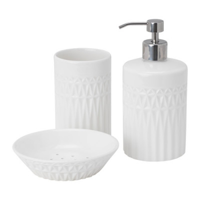 ست سرويس بهداشتی ایکیا مدل GAVIKEN از جنس سرامیک است. این ست 3 تیکه داري يك جا مايع صابون ٬ يك جا صابوني ٬ يك جا مسواكي است. از جمله محصولاتي است كه علاوه بر كاربرد راحت و مناسب ميتواند جلوه زيبايي به سرويس حمام يا دستشويي شما در محل كار و منزل بدهد.
