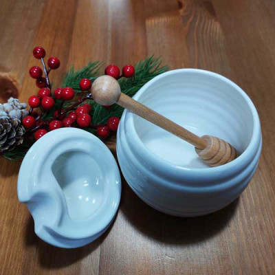 ظرف عسل سرامیکی HOME CENTER با طرحی شیک همراه باقاشق چوبی یک گزینه منحصر به فرد برای سرو عسل محسوب می شود.