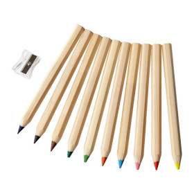10 مداد در رنگ های مختلف و یک مداد تراش